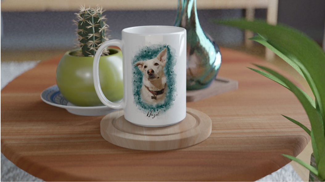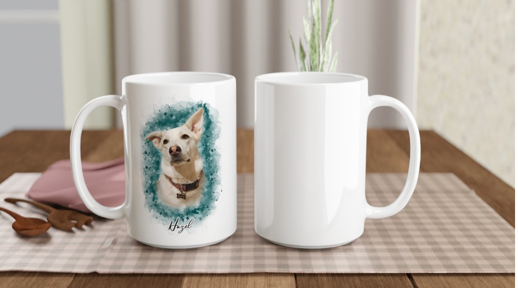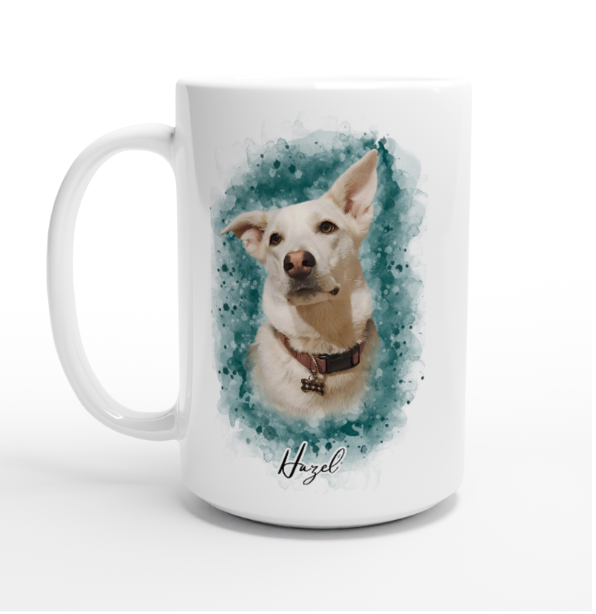 Start your morning off right with this beautiful, 15 oz ceramic mug adorned with your favorite portrait of your fur baby.
